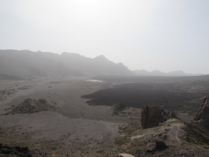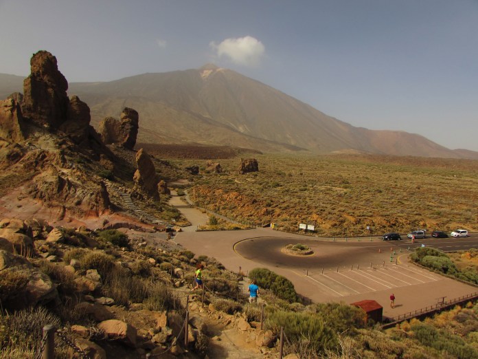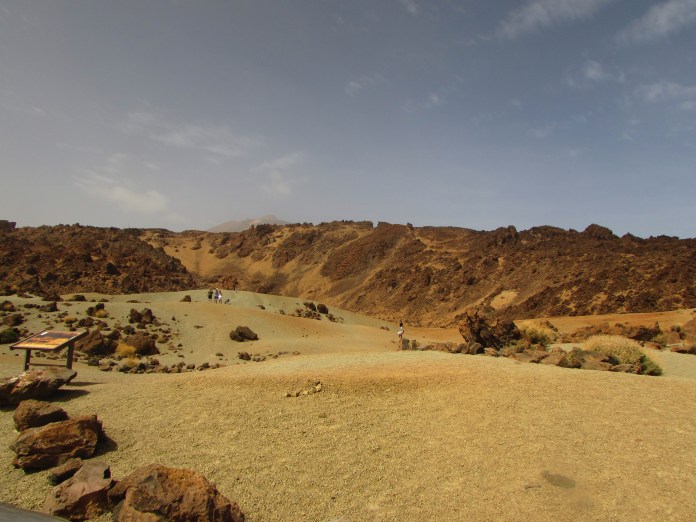 প্রায় ১৮০০ মিটারে এসে একটা বাঁক নিয়েছি হঠাৎ চারপাশটা যেন আবার হুশ করে বদলে গেল। গাছপালা জঙ্গল নিমেষে উধাও, শুরু হয়ে গেছে পাথুরে পর্বতরাশি। আগ্নেয় পাথরের সেই ভূমিরূপে বিচিত্র সব রঙ হলুদ থেকে কমলা আর বাদামী থেকে কালোর কতরকমের যে সংমিশ্রণ হওয়া সম্ভব, সেই পাথুরে এলাকা না দেখলে বিশ্বাস হতনা। আর খানিকটা উঠে চোখে পড়ল বিরাট বড় সাইন পার্কে নাসিওনাল দেল তেইদে (Parque nacional del Teide)। এখান থেকেই শুরু তেইদের চড়াই। আমরা তখন প্রায় ১৯০০মি উঁচুতে, আকাশ ঝকঝকে নীল, কোনো মেঘের চিহ্নমাত্র নেই, কুয়াশা ফেলে এসেছি নিচে। প্রায় ২০০০মি উঁচুতে উপস্থিত হলাম এক আশ্চর্য জায়গায় যার নাম মিনাস দে সান হোসে (Minas de San José) বাংলায় অনুবাদ করলে সান হোসে খনি। রাস্তার দুপাশে গাড়ি দাঁড় করানোর জায়গা। এ জায়গা আগে ছিল ঝামা পাথরের খোলা খনি। এখানে পায়ের নিচে জমি কমলা বাদামী মেশানো রঙের ঝামা পাথরের কাঁকর। হাজার হাজার বছর ধরে আগ্নেয়গিরির লাভা, সূর্যের তেজ, দিন-রাতের তাপমাত্রার ওঠানামা আর তেজি হাওয়া এই সবে মিলে তৈরী করেছে সেই অসাধারণ ছবির মত ল্যান্ডস্কেপ। সেই কাঁকরে ঢাকা ঢেউ খেলানো জমি রাস্তার ডানদিকে উঠে গেছে তেইদেকে ঘিরে থাকা পর্বত গুলোর দিকে। এদিকে তাকালে কাঁকরে ঢাকা জমিতে মাঝে মধ্যে চাগিয়ে উঠেছে ছোট বড় পাথরের স্তুপ। আর তার পেছনে অনন্য গরিমায় দাঁড়িয়ে আছে তেইদে পর্বত, ২২০০মি উচ্চতা থেকে দেখলেও মনে হবে পর্বতের মাথা যেন আকাশকে ছুঁয়ে আছে। অন্যদিকে রাস্তার উল্টোপাড়ে সেই কাঁকুরে জমি অল্প ঢালে নেমে গিয়েছে নিচের দিকে। সেদিকে খানিক দূর গিয়ে বড় বড় পাথরের চাঁইগুলোর ভেতর দিয়ে নিচের দিকে তাকালে সে দৃশ্যাবলী মনের মধ্যে চিরদিনের জন্যে গেঁথে থাকবে। পাথরের স্তুপের পর জমি খাড়া নেমে গিয়েছে কয়েকশ মিটার কিন্তু তারপর সমতল জমি বিস্তৃত প্রায় কয়েক মাইল, তার শেষে পর্বতরাজি উঠে গেছে কয়েকশ মিটার। তেইদের চারদিকে সমতলভূমি পেরিয়ে এই পর্বতগুলো নির্দেশ করছে পার্কে নাসিওনাল দেল তেইদের সীমানা, যার উল্টোদিকে ঢাল নেমে গেছে ফেলে আসা পাইন অরণ্যের দিকে। বেশি দেরী হয়ে যাবার চিন্তায় হাতের আর মনের ক্যামেরায় ঊষর সেই তেইদে উপত্যকার ছবি সঞ্চয় করে এগিয়ে চললাম মূল আকর্ষণের দিকে, তেইদে পর্বত আর কেবল কার যার পোষাকী নাম তেলেফেরিকো দেল তেইদে। মূল রাস্তার থেকে ডানদিকে মোড় ঘুরে রাস্তা খাড়াই উঠে গেছে তেইদের এই বেস ক্যাম্পে।